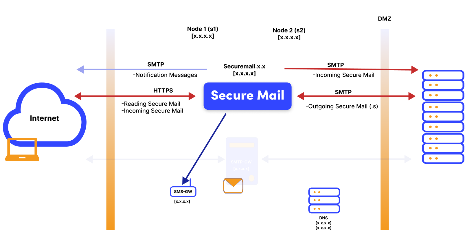All outgoing e-mails can be sent through Secure Email server (smart host) or only e-mails marked with ‘.s’ can be routed. There are three ways that Secure Email server can be located in a network: