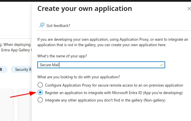 - Name your Entra ID Enterprise app and Click the “Register an application…” option