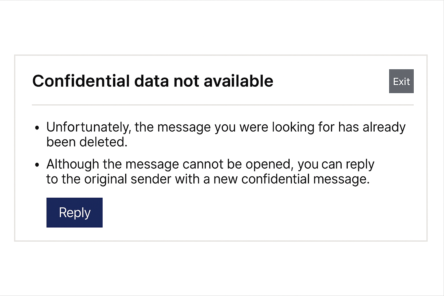 Allow reply to expired message (default: on): It is possible to reply to an expired message if a receiver wants to start a secure messaging with the original sender of the message. Although an expired message cannot be read, the recipient can reply to the original sender with a new secure message.