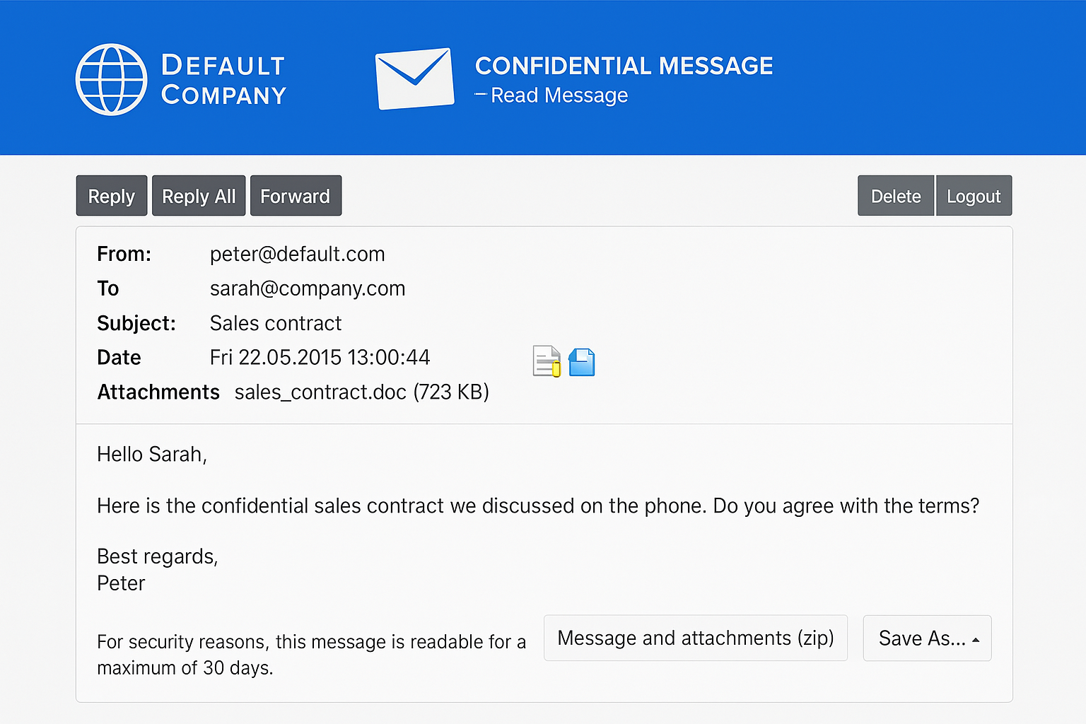 Example of a message that has been sent to an external user via D-Envelope (the user is reading the message in the web interface)