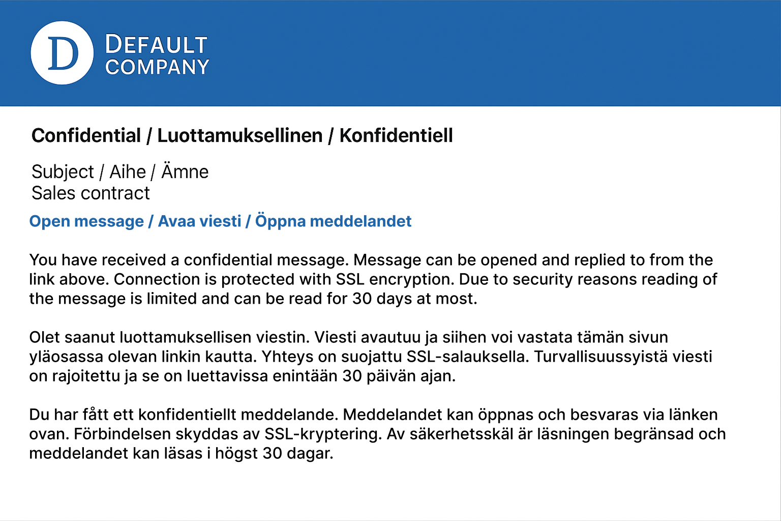 Instead of sending the e-mail message traditionally, D-Envelope sends a notification message to the recipient that informs about the confidential message. The actual message will be held on the Secure Email server and can be read using the link in the notification message. The link opens a TLS encrypted connection and includes the message identifier and the encryption key in an encrypted format. The link is protected with the MessageLock™ technology, so access for reading encrypted e-mail messages is limited. Cookies or password will be required to reopen the message later (see chapter: Re-opening of message).